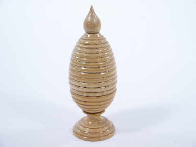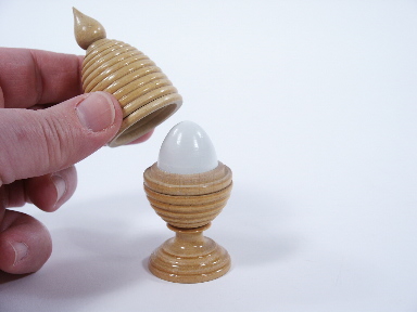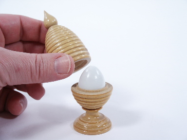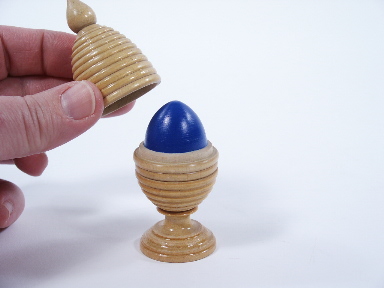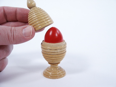 This beautiful vase of turned wood shows a red egg changing into a blue egg that in turn changes into a white egg which may then be removed! If you are one to collect turnings this should get the juices flowing. Condition very fine. Scroll down to see all pics. | |