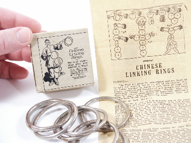 This scarce set of 8 rings includes the original box with graphics and instructions. The rings have light surface rust otherwise condition good. Box in very good condition. | |