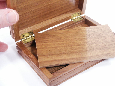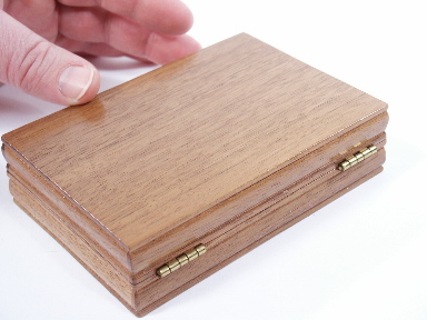 This beautiful mechanical card box is the finest above all with its attention to detailing and construction and style. A secret internal mechanism activated by pressure on the outside of box at the right spot allows a secretly locked flap to unlock and drop to the other side followed by another squeeze which locks the flap in place allowing for exchange or vanish or appearance of a card or other. Will accomodate poker size cards. Wonderful things may be said about Thayer or Carl Owen but this box has no peers. Unavailable for many years since Mr. Schenks passing. In beautiful condition. | |