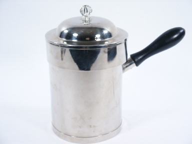 Doctor Burgun a highly skilled dentist whose hobby was magic and manufacturing beautiful first rate apparatus for performing magicians. It is unlike other types of Welsh Rabbit Pans in construction and made of stainless steel with several parts. It is actually a wonderful routine of comedy as the magician borrows a hat and places the pan in the hat with the pretense of pushing out the bottom of the hat. Following this action the magician takes and cracks eggs into the hat tossing in baking flour followed by a good squirt of lighter fluid and the expected match. Flames are seen above the brim of the hat and the magician realizes that the pan is what he should have been using and not the hat so he grabs the pan to stamp out the flames in the hat! After all this action the magician lifts the lid away from the pan and repeats the eggs and flour which is set on fire or not stating that the pan was still hot enough from putting out the fire in the borrowed hat. The lid is placed on and a magical gesture then the lid is removed and Happy Birthday here comes the cake from within the pan! The hat is lifted and shown to be without harm and returned to the poor spectator that was starting to talk badly about magicians. One inch surface area with tiny dimples in the body of the pan just under the bottom lip of the cover lid. Many thanks go to Ken Klosterman for assistance on some of the historical background of this wonderful piece. Residing in his Collection is one of the three known to exist. Circa 1940. | |