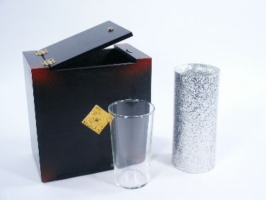 A wood cabinet with a hinged door on top and also one on bottom is lifted away from the table and the top door is opened. The magician takes a genuine pitcher or milk bottle (not supplied) containing milk and pours into the open cabinet?? The pitcher is set aside and the door closed and the cabinet is turned completely over bringing the bottom door to the top and the top is opened and the magician pours in more milk! This action is repeated 2 times more much to the puzzlement of the audience. The cabinet is set down upon the table and the door is opened and the magician reaches inside and takes out a glass of milk! This glass of milk is set down on a saucer (not supplied) and a cover of silver glitter is used to cover it on the saucer. Now reaching into the cover the magician produces a few dry silks (not supplied). The tube in turn is now held so the audience may see through it and the glass of milk has vanished! Setting the silver cover aside the magician picks up the cabinet and turns it 3 or 4 times finally opening the lid and reaching in he removes the tumbler of milk which he pours back into the milk bottle or pitcher! The silver sparkle cover is more flat than round at the rear seam not seen by audience and not affecting performance otherwise all in very fine condition. Includes instructions and unavailable for some time. | |