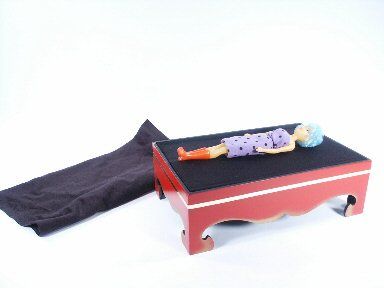 An attractive couch made of wood is shown and a doll 11 inches high is placed upon it followed by covering with a black velvet cloth. Holding the corners of the cloth the doll's form is seen to rise up and away floating in mid-air. Moving far away from the couch and higher into the air the magician at once gives the cloth a shake and the doll is seen to have vanished completely! A clever illusion made easy with the apparatus involved. Includes instructions. Condition very fine. | |
