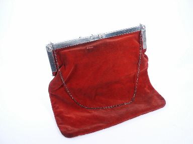 A red velvet bag with a beautiful nickled frame closure with chain handle with switching element activated by a tiny knob. The nickled frame has a sleeve over clasp which prevents the bag from opening prematurely. Bag has a 1/2 inch wear line in velvet showing material underneath but this is a small area up by the frame. Condition is remarkably good for this early Thayer piece. | |