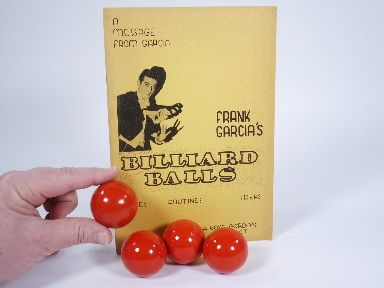 A beautiful set of turned wood billiard balls made in Germany measuring 1 5/8 inches along with Frank Garcia's Billiard Balls published in 1960 numbers 23 pages with illustrations to start you on your way on this enjoyable and rewarding branch of magic. Condition very fine. | |