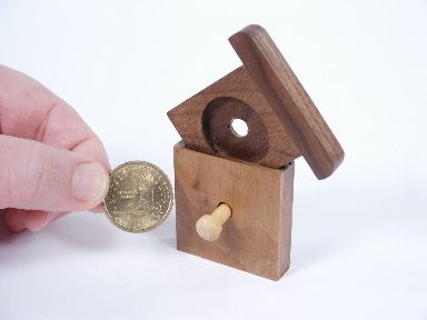 A year 2000 Golden Dollar US coin is placed in a well of a walnut wood slide with handle that also has a smaller hole on its underside. The slide is placed into a walnut wood case that has a small hole bored through its center. The coin is visible from the front and rear sides of the case by the spectator prior to positioning the case at a horizontal level.