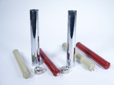 Well made of metal you receive four shell candles being two red and two white along with lighter fluid reservoirs so they may actually be lit during performance. You will also receive two nickeled tubes with cover caps. Both tubes have circular openings at rear to align with same size openings in the larger size red and white candles. The height of largest candles is 9 1/4" with a diameter slightly larger than 1". No instructions. European made. Have fun. Condition very fine. | |