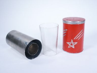 One nickeled tube with the trademark stamp of Triks shown empty followed by the production of a glass on the open palm up hand. This glass is then placed into a decorated container with lid that is also trademarked with the Triks stamp. The lid is taken off and the glass removed and seen to be full of Cola beverage or other! Condition very fine.