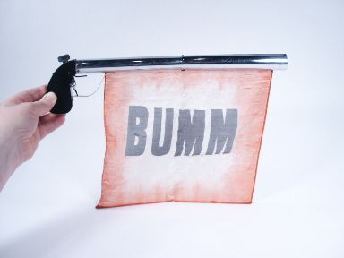 This is 9 1/4" in length prior to pulling the trigger and releasing the silk that says Bumm instead of Bang. Made of wood and metal. The Gun in very fine condition. The Bumm Silk is worn but snap fastener arrangement allows for replacement. .