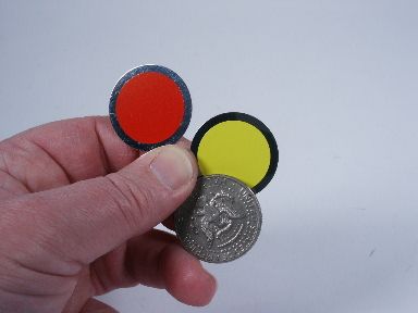 Showing a red disk a magical pass causes it to turn yellow. Another pass it turns green and then yet another pass it changes into a silver half dollar which is handed for inspection if desired. Includes ungimmicked half dollar and 2 pages of illustrated instructions. Condition like new. | |