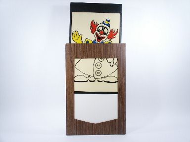 From Great Britain comes this visible painting unit that measures 18" x 11 1/2" x 1/2" thick. A black and white line drawing of a clown within the frame visibly colors as it is withdrawn giving way to several possibilities for use to entertain the children and the adults as well. Includes instructions. Condition very fine.