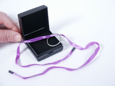 From 1990. From a jewel box a ring and silk ribbon are removed with a spectator examining both. With the box open the ribbon is placed across with ends hanging down and the ring laid over the ribbon. The box is closed and the spectator is asked to take hold of the ends of ribbon and then the spectator is asked to draw the ribbon from the box and the ring comes out linked to the ribbon! This includes the special made box along with ring and silk ribbon also included are 2 pages of photo illustrated instructions. Condition very fine. | |