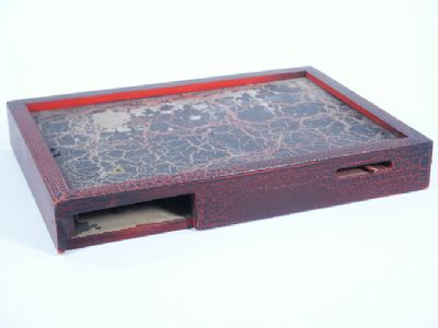A heavy type drinking tumbler along with a tray and a silk are shown. The tumbler is placed upon the tray and the silk placed inside the tumbler. In an instant the silk will vanish with lightning speed! The tray is constructed of wood and metal with mechanism contained within. Paint absence from tray surface otherwise very fine condition and a difficult piece to obtain. Silk and tumbler not supplied. Includes instructions. | |