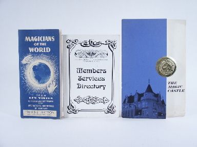 Magic Castle Brochure with photo illustrations. Light soil bend with 1/2" break bottom corner. Magician's Of The World by Len Vintus. Directory with photos. 114 pages. Magic Castle Member Services Directory 152 pages. The late Jerry Andrus was known as a magician's magician. A rare individual possessed of many talents creating magical effects and optical illusions enjoyed around the world. This auction listing is from the personal effects of Mr. Andrus. | |