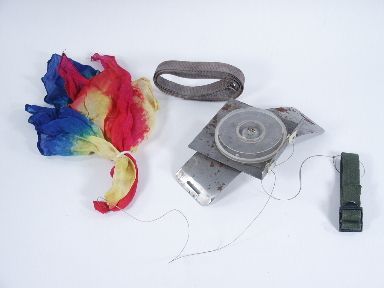 Made to be worn around the body with belt attachment. This is made of metal plates with attached disk wheel assembly having one large diameter and one small diameter each having cord attached so that when a small movement pull is made on the small diameter the large diameter takes up quickly a great length of cord that is attached and in this case to a rainbow silk. Surface rust on areas of the metal plates. This is quite an involved piece of manufacture.