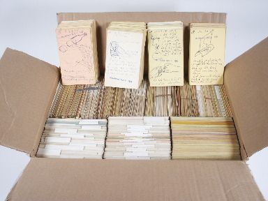 Within the home of Jerry Andrus which was known by many as "The Castle Of Chaos" note cards were found. Not just a few but rather almost 3 feet of 3 x 5 note cards. Jerry Andrus kept 3 x 5 note cards in his pocket at all times and whenever an idea struck his mind which was almost constantly he wrote that idea down. These notes includes ideas for song titles made up words random thoughts and "Scribulations". The cards also include notes on how to improve magic tricks ideas for new magic and effects that might be created if one could think of a method. These many cards represent the musings of an eccentric genius and will give many hours of insight into one of the most creative minds in magic. A real find. The late Jerry Andrus was known as a magician's magician. A rare individual possessed of many talents creating magical effects and optical illusions enjoyed around the world. This auction listing is from the personal effects of Mr. Andrus. | |
