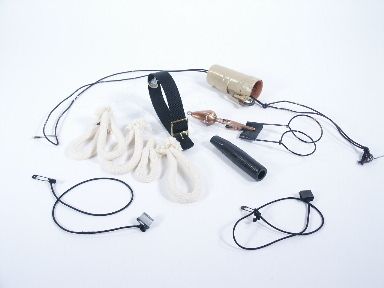The Miller style Holdout includes a ball attachment and bill or cigarette attachment and several rope loops. Also included are 2 clip pulls for vanishing coins and a pull vanisher with flint wheel. Condition very good.