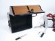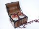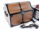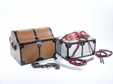 Measures 12" wide x 9 1/2" deep x 9 1/2" high. The Magician shows a chest made of wood and metal and setting it down the hump back lid is opened and from within a Treasure Chest is removed. From this Chest items are shown such as weapons a pirate would have and the gold coins expected to be found in such a Treasure Chest. Long cords are shown and wrapped around the Chest securing its bounty. The ends of the cords are held by volunteers standing on either side and even though all is fair the Magician is able to cause the Treasure Chest to escape from its cords and make away with the contents! Moving back to the antique looking hump back Trunk the Magician tips it toward the audience and opens the lid for a view inside showing nothing but an empty trunk. Closing the lid and bringing it back to an upright position the lid is lifted once more and a large variety of items are produced from within or a couple of live doves or small rabbit! The nice thing about this is the combination of effects as at first the Treasure Chest is removed from the hump back Trunk clearly without stating so the Trunk is empty. The Treasure Chest is fashioned with movable pins at the openings through which the cords are passed enabling for a type of Grandmother's necklace or Cords of Fantasia effect. After the Treasure Chest effect the tip over Chest principle is used with the hump back Trunk. The Treasure Chest is made in a special way that allows it containment in the Trunk. Cue Cards have been affixed to the top of the Treasure Chest as a reminder of patter lines to say. No instructions came along with this. Condition very good. | |