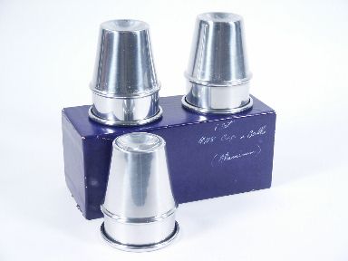 A First Rate Collector's Condition set of trademark stamped cups in aluminum in the original box stating contents. Includes instructions and one you should not pass by.
