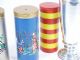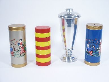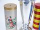 This is a beautiful set with Asian designs upon the covers. A beautiful set and trademark stamped. Includes instructions and one you will surely perform and enjoy as display in between showings. A couple of light marks to cylinders and one tiny mark to the vase all in very fine condition.