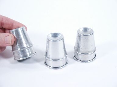 In aluminum these cuties stand 2" high with a mouth diameter of 1 5/8". In very good condition.