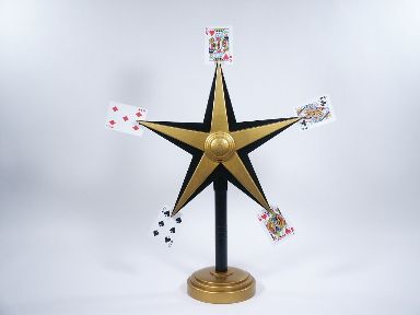 After 5 cards are chosen and returned to the deck with a shuffle the deck is made to cascade at the star where suddenly the selected cards appear at the points of the star! Not only a fine performance piece but one you will enjoy seeing in your collection as well. Condition very fine. | |