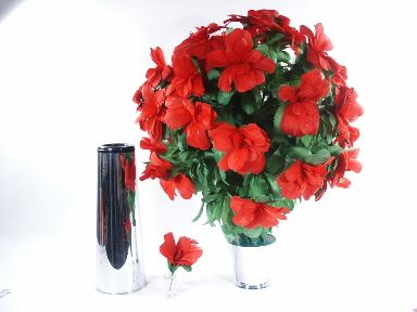 This large botania all in color of red blooms which look most realistic in the opinion of many. The megaphone style chrome cone is rested upon a pot also of chrome and a single red flower is dropped within. The cone is lifted and nothing has happened and this may be repeated until finally much to the surprise of the audience when the cone is lifted a huge growth of beautiful red flowers makes an appearance! A couple of petals have white markings and the metal cone has light surface corrosion at the very bottom edge. Units like these usually sell for $1,500 and up. Good used condition. | |