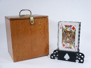 In the 1950's classic magic builder Bob Kline developed this method for the rising of jumbo cards. As only 6 units were made this is not an easy find. The styling of the houlette is classic Kline and uses plex of black white and clear. The houlette may be moved about freely with no connections to tables in any way.