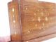 Made of beautiful grains of Walnut wood and inlaid with Brass. Measures 7 1/2" wide x 2 7/8" deep at the base and stands 4 3/8" high. A beautiful and quite detailed work nice to have for a desk or coffee table or mantle to have at ready 2 decks (not included) for performance of a good trick. Condition beautiful.