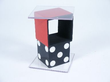 Two Plexiglas plates 3 1/4" square along with a wood box 2" in size having no top or bottom are shown. The box is placed between the plates and all is shown with the audience being able to look right through the cover/box seeing nothing within. A magical pass is made the top plate removed and now the wood box is lifted revealing a solid black die with white spots which is raised slightly and dropped back upon the plate showing its solid state. Includes 2 pages of illustrated instructions. One of the adhesive white paper spots absent a sliver of the paper otherwise condition fine. | |
