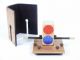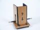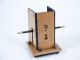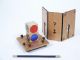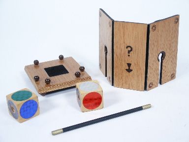 An illusion in micro magic style. Two cubes each 1 1/8" in size and each with a single hole through the center. The cubes are shown and placed upon a platform and shielded from view by a tri-fold screen. During this operation the open side of the screen is turned toward the spectators. The magician takes the wand and inserts it through openings in the side of the screen making sure the wand passes through the hole in the top cube again all in view of the audience. The screen and platform are now turned toward the magician. Taking both ends of the wand the magician slowly pushes the wand down which of course is impossible as both cubes are solid. Letting go of the ends of the wand the magician turns the screen and platform back around to the audience and it is clearly seen that the wand is now through the bottom cube! All is made of wood and when you find out how this really works you will just not believe it as both cubes I guarantee are solid. Produced in Limited numbers and from 1984. The flocked material that lines the interior of the screen is relaxing some and coming away but not affecting working. Includes instructions. Condition fine. | |