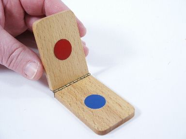 Made of solid natural finish wood with piano hinge and made in Germany. The wood boards are hinged open to show a red spot and a blue spot. The boards are closed and opened again showing the colors have changed to black and yellow. The magician places his hand over the black spot for a moment and it changes to blue! The hands are shown empty and the boards are handed for examination. Includes instructions. Condition very fine.