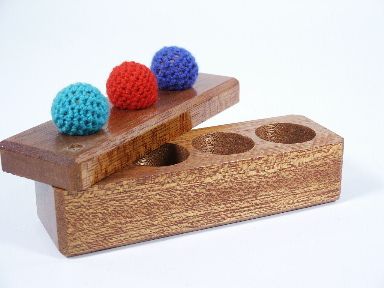 After showing a nice solid wood container with three balls displayed on top one green one red and one blue the magician asks a spectator to select one of the three. The spectator is asked to place the three balls inside the box in any order and the lid is replaced handing the box to the spectator to hold.