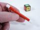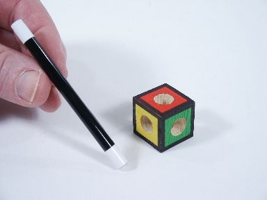 Micro magic involving a tri-colored cube having holes bored completely through all sides. The magician takes a miniature wand that is black with white tips and inserts the end into the cube on the green sides. It is seen to pass back and forth normally.