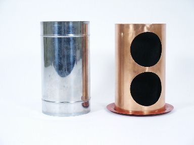 Two cylinders one in copper and the other chrome metal both a little over 7" high and resting upon a copper metal base both shown empty. Nested together makes the magic happen as then a production of silks or spring flowers or whatever you deem fitting for the performance. The illusion is very good and includes illustrated instructions. Condition fine. | |