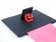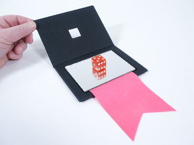 Showing a folder made of plastic it is seen that it holds a large double face mirror and in the center of the folder is a small square opening just large enough to accommodate the red die. A spectator is asked to hold the large ribbon that is attached to the mirror and the small flap covering the opening is lifted and the die is placed upon the mirror.