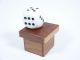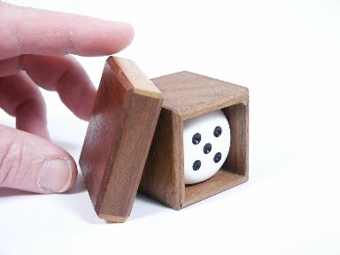 Made in walnut wood and making use of a 1 1/4" white die with black spots which by the way is good if you are concerned about the possibility of choosing a color blind spectator to work with you on the effect. The effect is one of the trick known as Color Vision and the spectator is allowed to place any side of the die face up in the box to the number he selects or the number he selects may be placed face down followed by closing with the lid. The magician takes the box in hand and is able to correctly name the selected number. Includes illustrated instructions. Condition very fine. | |