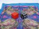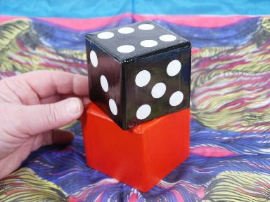 A clever and nice visual penetration with a finish. A black die with white spots is seen resting upon a silk and the magician places a red cover over the die. The four corners of the silk are gathered together and the magician lifts it up taking the die and cover with it. Suddenly the die is seen to be coming from the bottom of the silk! It does but it is without spots! The bottom of the silk is immediately shown to be complete and without damage and the cover is taken from inside the silk then shown and turned over and a shower of spots come from within falling to the floor! Includes 2 pages of instructions and the colorful silk shown.