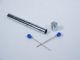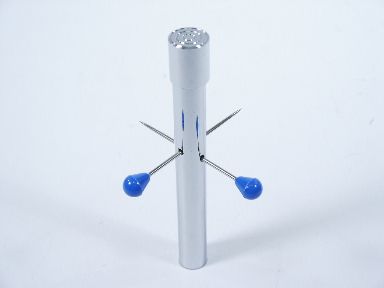 A plated tube of brass with a cap is shown along with two metal spikes. A cigarette is dropped in the empty tube and the cap used to close it within. The two spikes are pushed through in holes in the sides of the tube in intersecting direction. Clearly the cigarette has been impaled. Spikes are removed along with the cap and the cigarette is let fall out and seen unharmed! All may be examined as this is a mechanical piece. Includes instructions. Condition very fine. | |