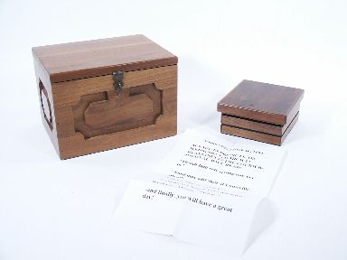 None made ever finer for Professional Performers and built to last. When the spectators open the chest to see the prediction it is a folded piece of paper measuring 6 3/4" x 11" when opened. Some of the chests had a clear plastic box that the chest would fit in and a lock could be used through eyelets in the plastic box to lock it. Not all were sold with this plastic box. This chest was made by Arturo and is stamped by Arturo on the interior. Condition very good. | |