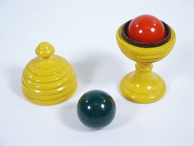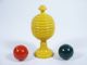 Of turned wood the combination is one red ball, one green ball and one red shell assembly. Ball measures 1 3/8". Condition very good.