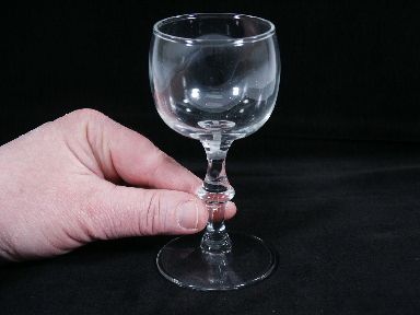 Based upon the hydrostatic glass where water remains in a glass turned upside down until the performer desires for gravity to take over and the water suddenly fall out from within. In this specially made glass you will find that the grip on the wine glass is by the stem without the fingers on the goblet section. This is a genuine glass product, that is why it involves more in the manufacturing process. Includes instructions. Condition very fine. | |