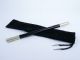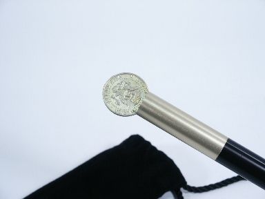 With this well thought out piece you may begin your routine by pointing the end of the wand directly toward the audience as they will see nothing but the solid tip of the wand. The wand is of metal and black with satin finish gold tips contained within a soft cloth drawstring bag having Silver metal tips on the cord ends.