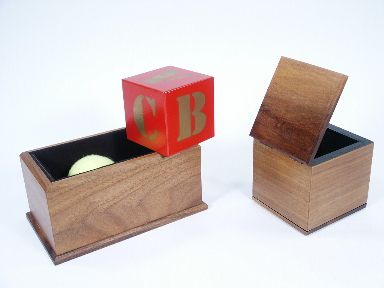 Circa 1990's, Mel Babcock stage version with 3" block. The magician takes an alphabet block and places it into a handsome wood box from which it then vanishes. The magician takes in hand an oblong wood container open at top that is empty and suddenly the block makes an appearance within! As suddenly as it appeared it now vanishes and the container is set aside. Reaching over to a paper sack or a hat the block is shown to have made an appearance within!