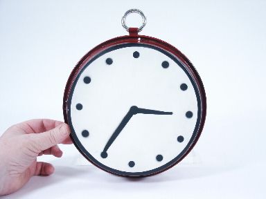 A Kitchen Clock that is double faced and measures 8 1/2" is shown to have permanent painted hands on both sides or faces of the clock. Both faces of the clock show the exact same time. The clock surprisingly loses its sense of permanent timing and suddenly shows a variety of different clock times even though the clock is merely held by the ring at its top. Based upon the Dizzy Arrow effect this is made with a mechanical feature which enables the effect to happen. This would also make a good item for an MC using a variety of themes. Made in metal. Includes instructions. Condition very good. | |