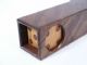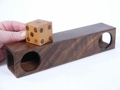 In beautiful grains of natural solid wood an effect made popular many years ago where the magician places a die in one end of a tunnel in which it just fits and the numeric value is noted that is seen in the opening. The die is pushed through the tunnel with a magic wand (not included) or other and when it reaches its destination at the other end of the tunnel it is seen that the numeric value has changed as it comes into view in the opening on the other end! The die is 1 9/16" in size and made of wood with inlaid spots. Condition very fine. | |