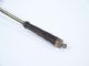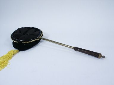 A true antique with carved wood handle with brass rod and metal frame. Somewhere along the life of this piece the outer part of the bag has been replaced with new tassel and gold lame around the rim frame. Condition fine.