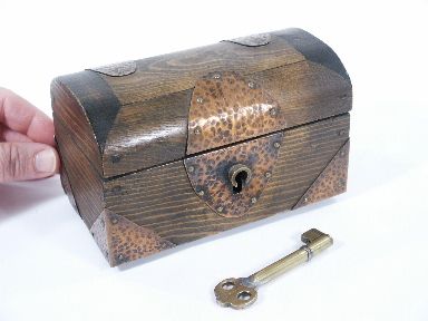 A very scarce and hard to find Prediction Chest, circa 1940's, measuring 6" wide x 3 5/8" high x 3 1/2" deep along with a single key that opens the lock for the spectators to find within the prediction written upon a slip of paper. Includes 3 pages of instructions. Mentioned is an extra ungimmicked key but this is not present. Condition fine. | |