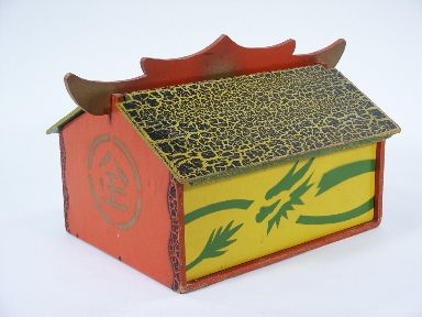 This cabinet in the style of a Chinese Temple is shown without the front and back panels and with the roof sections lifted. The panels are replaced in the grooves and the roof sections lowered. After the showing of the empty condition of the cabinet the magician is able to produce a quantity of silks (not included). The gimmick has been changed from wire to rubber band. A scarce Reidel item. Includes illustrated instructions. Condition very good. | |
