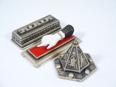 The spectator takes up the hand and rests it upon the point of the pyramid and spins it again with the magician touching nothing during the process. The hand spins to a halt pointing at one card only and the other cards are turned face up none of which is found to be the selected card. The one card left the one the hand is pointing to is turned face up and found to be the selected card!