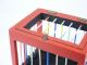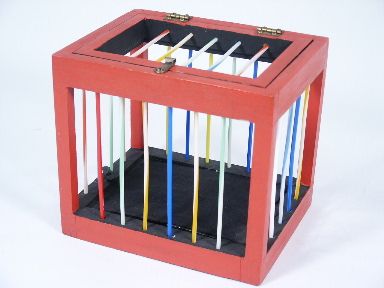 A small wood cage with a spring loaded flap at the bottom. The bars are made of plastic drink straws and a few have bends. Condition very good.